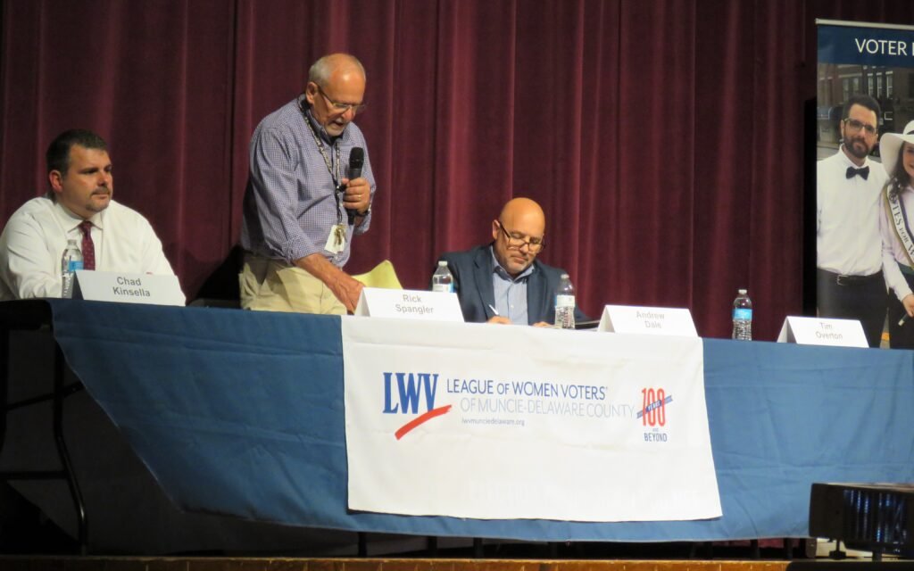 The event, hosted by League of Women Voters of Muncie-Delaware County, took place at Muncie Central Highschool and planned to be an educational event on the matter of vote centers. Executive Director of the Voting System and Technical Oversight Program Chad Kinsella gave a presentation to an audience of close to 30 people on what studies show on the effects that vote centers have on cost, accessibility, and turnout for each election cycle. This followed with Democratic chair Andrew Dale and County Clerk Rick Spangler announcing that compromises were made, after a dispute between the party chairs on where early voting site(s) would be placed. Dale originally asked for First Presbyterian Church to be an early voting site in addition to the county building, while Overton called the idea far left and radical. Dale said at the event that he would be open to the local GOP choosing a second early voting location, telling Overton “name your spot.”