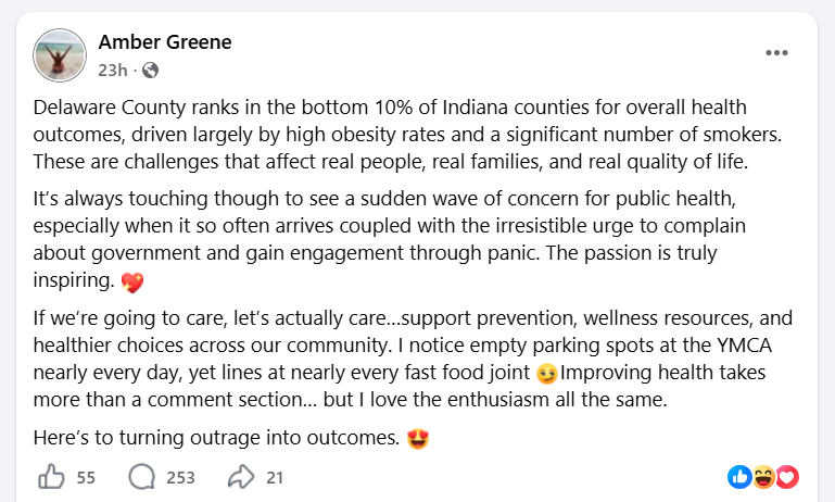 Since starting as Communications Director in 2024, Greene has been frequently criticized. Commenting on social media has been restricted throughout her time running the Facebook page, and livestreamed recordings of public meetings stopped being shared. In late 2024, Greene’s position became one of three that had to be funded with Mayor Ridenour’s EDIT (Economic Development Income Tax) funds after Muncie City Council cut the three positions from the general fund. A year later, after council became majority Republican, the funding for her position was brought back.